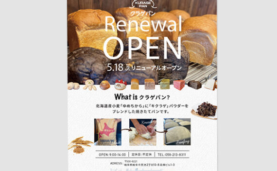 合同会社あさひ様が運営するクラゲパン様の「リニューアルオープン告知チラシ(A4サイズ)」を制作させていただきました。